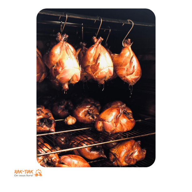 Sélectionné avec soin, le poulet est mariné dans un mélange d’épices africaines, puis fumé lentement au bois naturel, sans additif ni fumée industrielle. Le résultat : une chair juteuse, une peau parfumée, et un goût fumé relevé juste comme il faut.